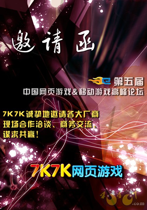 由中华网发起并主办的第五届中国网页游戏&移动游戏高峰论坛于2012年4月19日在江嘉兴举办,届时7K7K将与游戏产业各方精英齐聚一堂在此进行思想交流与合作。届时,7K7K诚挚地邀请各大厂商现场合作洽谈、商务交流、谋求共赢!web.7k7k.com