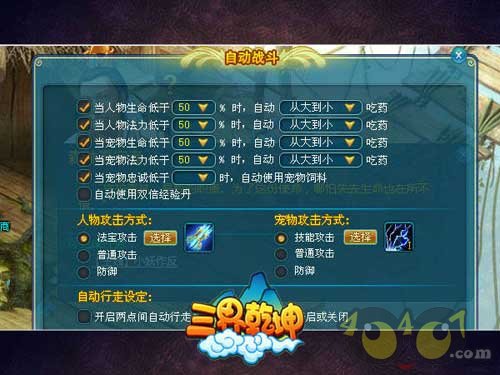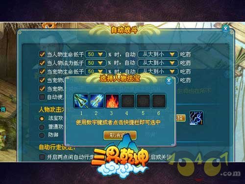 二、当人物或宠物的生命值或法力值低于一定数值时,可自动为人物或宠物吃药,保持生命数值以战胜妖魔。