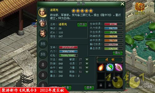 聚游《凤凰令》中,每一名战将都拥有不同的资质。悟性决定战将可以领悟的技能数目与技能实力,而生命、内力等八大属性值则通过加点来进行调节。在游戏中,战将每升一级,都将获得相应的点数,在敏捷、体质、力量、筋脉四大方向进行加点。