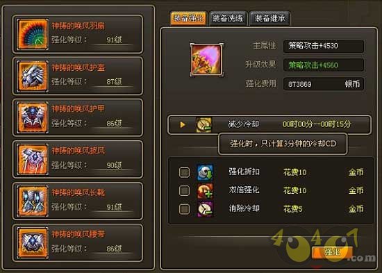 另外,在闯关活动中经常碰到会强化任务,因为没有银币做任务而放弃,就会白白浪费了完成任务的银币和军令,如何在这里省出钱来呢?随着装备更新换代,大家都喜欢把等级低的装备卖掉,其实可以留1-2套低等级装备,在遇到闯关强化任务时,选择低等级的旧装备去强化,这样既可以花最少的银币完成强化任务,又可以得到银币和军令。旧装备很烂的话,你还可以挣钱,因为强化低等级装备需要的银子少,而你完成任务得到的奖励多。