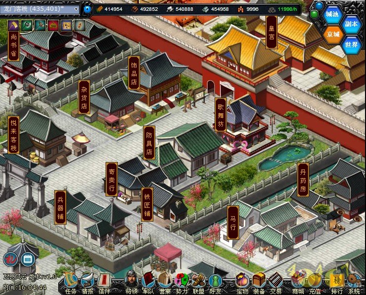 京城是游戏中实现众多功能的场所,它包括皇宫,歌舞坊,尚书省,悦来客栈,铁匠铺,丹药坊,寄卖行,马行,兵器铺,饰品店,杂货店,防具店。