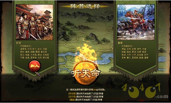 l 游戏中玩家在创建角色后会进入阵营选择界面,点击你希望加入的阵营或选择听天命(可获得额外金币奖励)进入游戏。