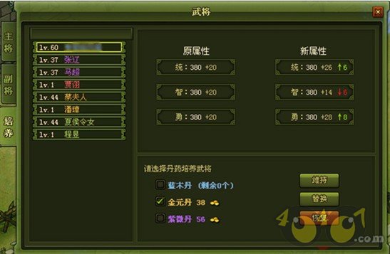 l 左边列表中黄框选定的武将为本次培养武将,列表最顶端为主将。
