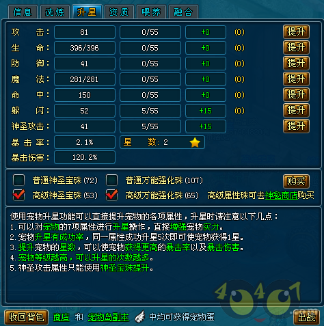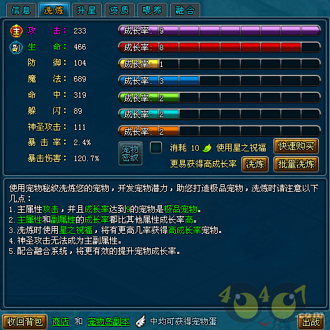 培养自己的极品宠物,除了通过升星与刷新资质,还有就是洗炼与升级了。宠物洗炼系统板面改版,清晰明了的属性成长更加直观,还可以通过星之祝福提高洗炼高属性宠物的机率,主攻且成长率为9的宠物是极品宠物,同时通过将多余的装备喂养,还可以达到快速升级的目的。