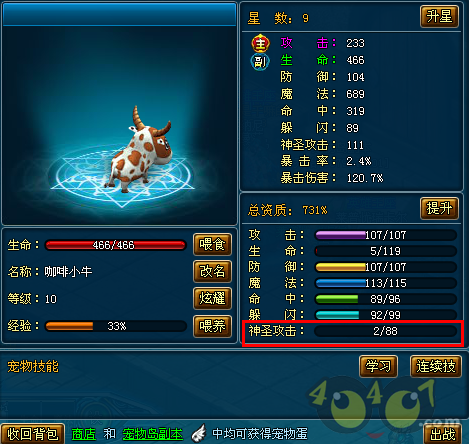 除了增加了宠物融合系统,还新增了神圣攻击属性,神圣攻击对目标造成无视防御的定量伤害,随着神圣攻击属性越高,即使是数千防御,也能轻易打败,而之前的技能将会全部清空,在未来的版本里,会有全新的宠物技能系统与大家见面呢。
