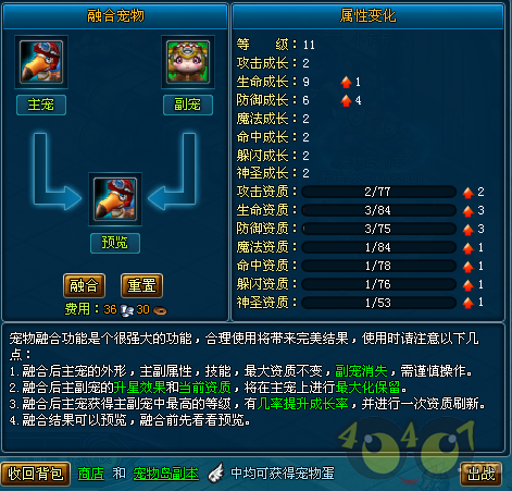 宠物多了不用愁,新增的宠物融合系统能回收多余宠物,并附送资质刷新功能,有几率提升成长率,以后就可以到宠物岛多抓宠物,多多融合了。