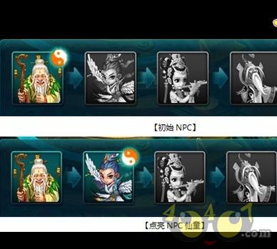 初始情况下,只有山神是可以点的,点击后,有几率获得所有颜色的仙丹,并触发下一个NPC,即仙童。