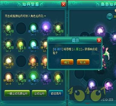 仙丹可以吞噬其他仙丹获得经验,经验达到升级所需后,则仙丹升级,属性增强。