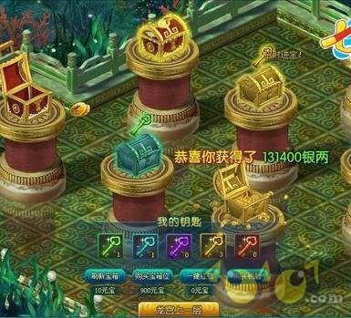 清扫完龙宫第一层后,遛到龙宫第二层,这就是宝库了!!!柱子摆放着不同颜色的箱子,再看看我的钥匙,挑一把颜色相同的插进去。耶,打开了!有银子咯!!!