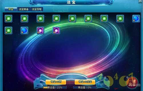 银子寻宝:适合新区,新区玩家缺元宝不缺银子(拉镖、任务都可以获得大量银子),所以可以通过银子去寻宝比较实惠,银子寻宝寻到完美的法宝概率也是非常高的,寻一轮也就5锭多银子,寻得次数越多,幸运值越高,获得完美的法宝的概率越大,运气好就能在这一轮中获得完美的法宝。