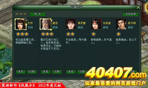 在《凤凰令》中,玩家可以招募的战将有星级之分,一星、二星是普通的江湖豪杰,三星以上则是三国中赫赫有名的实力战将,在攻防、属性等方面都达到一个新的高度。虽然招募战将有一定的运气因素存在,但玩家可以通过“请客喝酒”、“到时刷新”等方式来招募自己想要的战将。