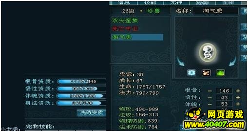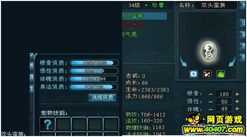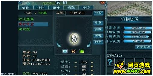 下面我说下BB,30之前你的BB比你还要强力,现在大家比较喜欢的BB有双头蛮族,和死亡守卫(本人等级有限)。双头蛮族可以在21级的时候进入不归山蛮族洞抓取,死亡守卫在皇城地下就可以抓到了。说下抓BB的工具抓宠物是需要道具的,目前有2种,1种是紫金葫芦,可以抓20+一下的宠物,新手任务和新手礼包就会送的。另1种是缚妖锁,在凌风城宠物商人有售,要10银1个,可以抓50+一下宠物。BB的好坏是由初始的属性和成长和属性资质所决定。70成长宠物升了10级随到的属性点分别是2点根骨2点悟性2点根骨1点体魄 10级一共随到了7点属性而一直60成长的可能就只随的到6点资质对应的是宠物在得到同样的属性点时对宠物各项具体属性的振幅举个列子一个攻击资质1500的宠物100点根骨的情况下物理攻击有800 那么一个1100攻击资质的宠物在100点根骨的情况下实际的物理攻击却只有700。