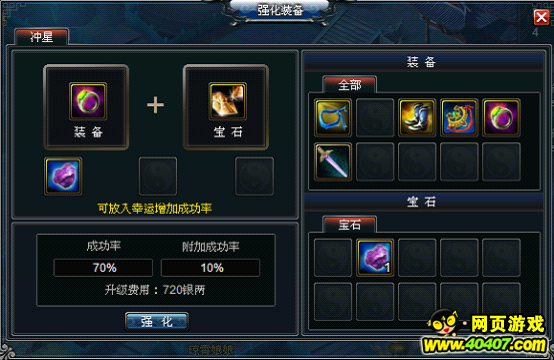 装备每次冲星其属性都会进行成长。1-4星需要一级强化宝石,5-8星需要二级强化宝石、9-14星需要三级强化宝石。星级越高,强化成功率就越低,但可以使用幸运石来增加成功率。幸运石和强化石可以通过做任务推图的方式获得,也可以在商城中买到。