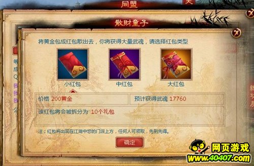 其他玩家可以在江湖中看到红包,并抢着领取,领取红包可以获得武魂,并有概率获得黄金