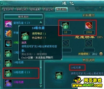 2, 如果你用的是14格的包裹:那就在背包里提出14格空位,然后将14格包裹取出包裹栏或从商城中礼券商店购买,打开右下角“炼化”,点开“新年活动”界面,即可看到各格包裹炼化途径。材料:14格包裹,10个红包---16格包裹;