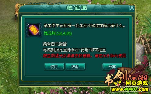 打开藏宝图后,玩家可以看到图中所包含的全部信息,只要点击绿色的坐标,玩家就可以十分方便地找到宝藏埋藏的地方。比起江湖上许多人一辈子都无法参透图纸奥秘的例子,《书剑江湖》中的玩家就显得幸运的多。不过藏宝图是由一种特殊的水蜡写成,如果打开超出了一定的时间,那么宝图就会变成一张废纸。所以,玩家们一定要抓紧时间,尽快将宝物挖出来。