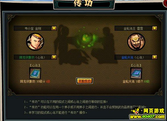 【传功】功能可以将一个弟子的招式或心法等级,传承给自己或其它弟子的指定招式或心法。