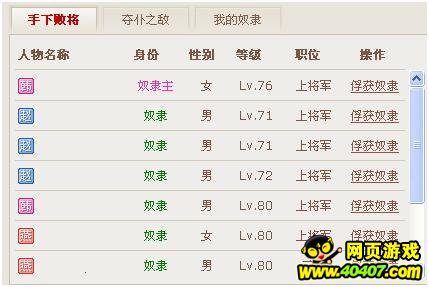 当你在竞技场中战胜一个20级或以上的对手后,他的名字就会出现在【奴隶市场】中的“手下败将”里面。如果你是个奴隶主,或者是自由身,就可以在这里再次挑战他,此次挑战如果胜利,他就是你的奴隶了!不过要注意,20级以下的玩家是不会被抓为奴隶的,因此也不会出现在手下败将名单中。