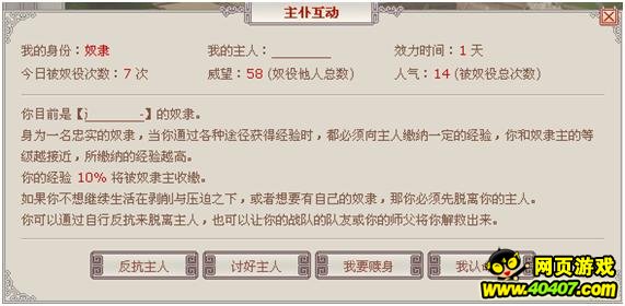 点击“我的奴隶”效果跟点击主界面上的“自由身”或者“奴隶主”链接效果一样,都进入主仆互动界面。