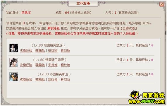 在战国时代,拥有奴隶、或者当别人的奴隶都是很正常的事。当了奴隶,就要给奴隶主干活,从而给对方产出一些经验值。不过,当奴隶对自己来说倒没有什么实质的损失,只是不能再奴役别人而已。