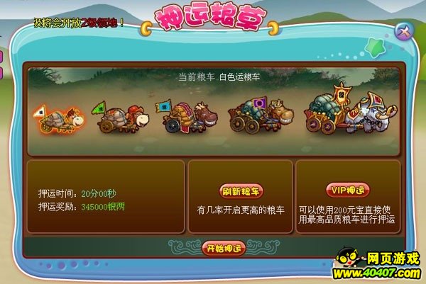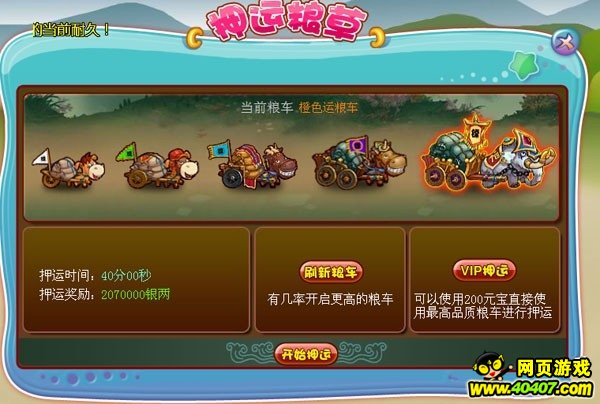在富甲三国新增加的押运粮草功能中,玩家每天有3次机会获得最终的奖励。每次玩家都可以选择需要押运的运粮车,不同的运粮车最终奖励也会不同。如果有幸选择到了橙色运粮车,那么百万银两就将在终点中等着你!