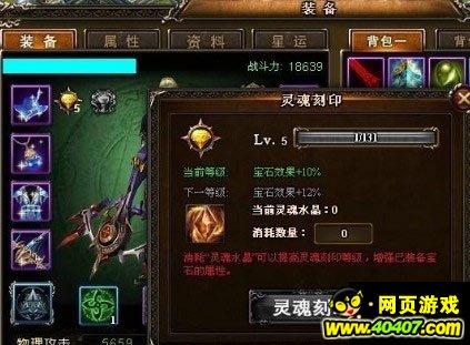 玩家只需点击装备界面的灵魂刻印的图标,弹出刻印界面后,通过消耗相应的灵魂水晶来提升灵魂刻印等级。