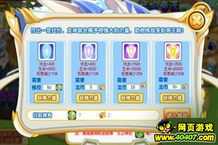 在挑战之前,付出一定的代价,可以获得龙神增予的强大力量,帮助你挑战【圣焰帝王】。