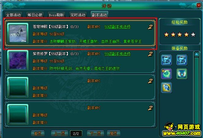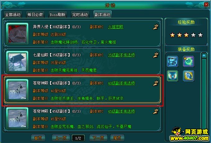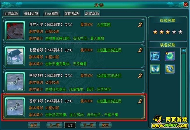 主要产出:经验、35~55级蓝色装备、40~50级绿色装备、紫色神器灵石、蓝色强化石