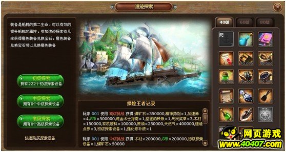1、遗迹探索玩法设定:遗迹探索分为三个层级,分别是40级、60级、80级,到达相应船舰等级级后开启,每种探索对应不同级别的橙色宝石。