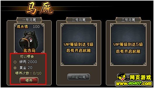 马厩饲养位一共有三个,除了第一个获得马厩时久默认开放之外,其他两个要在玩家VIP达到一定等级后,才有权限开放。