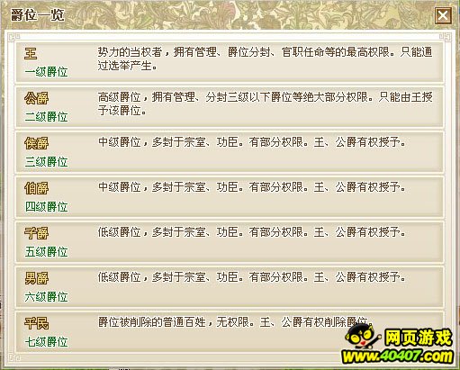 | 公职 | 只有公爵位的玩家才有资格担任该职权。 | 势力领袖 | 势力领袖 |