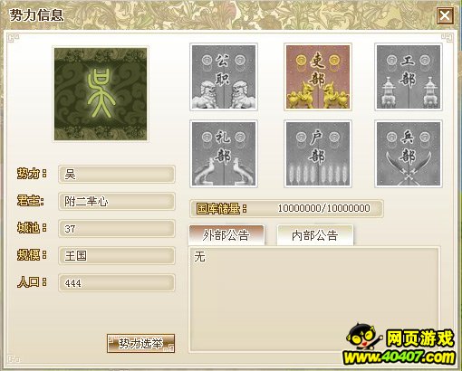 | 吏部 | 吏部掌管本势力的所有官职任命。 | 全体子民 | 势力领袖和获得授权的公 |
