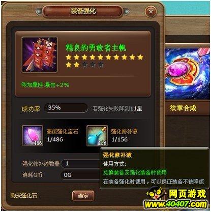 强化过程可以使用修补液提高成功率,每个修补液可增加5%成功率。