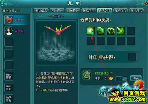 兽魂封印,是让灵宠学习新技能的方式之一。玩家玩家可以将多个灵宠的实用技能封印并集中到一个优秀的灵宠身上,打造属于自己的极品灵宠。但是,每次封印需要消耗玩家1个与灵宠等级相应的兽魂封印道具。