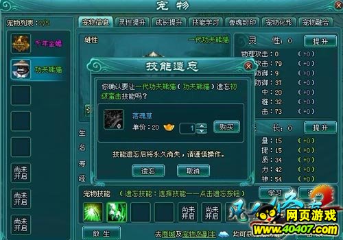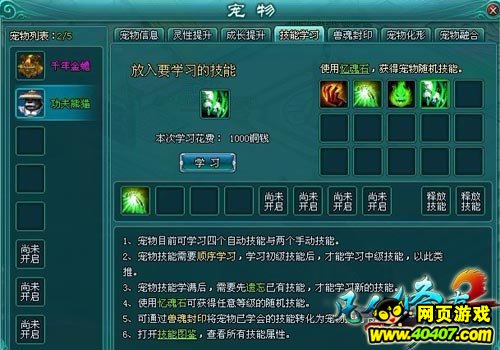 技能学习,玩家还可以通过灵宠界面上的技能学习功能,让技能未满的灵宠学习所有种类的初级技能。灵宠没学习一个技能,都将消耗掉相应的技能书和少量钱币。此外,灵宠要学习更高等级技能时,需要自身已有该技能的一级技能。