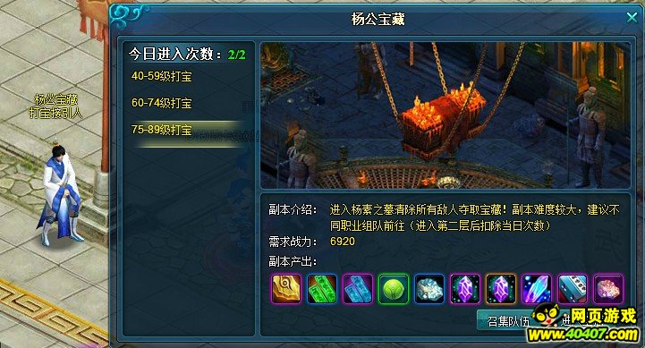 副本介绍:杨素之墓里蕴含着大量的宝藏,要想打造好装备,杨公宝藏一定是不二选择,这里除了可以拾取宝箱获得大量的锻造石、开孔符之、合成符等强化装备的材料外,消灭各层BOSS还会爆出五彩石、刻印石等稀有宝物。杨公宝藏里各种宝物汇聚,你是不是心动了呢?那就快快来挑战吧~