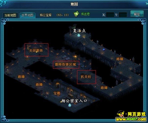 这一层为队伍地图,同一队伍的玩家在一张地图内,地图中央有箭阵伤害区域,玩家进入该区域将受到万箭齐射的伤害,被秒杀。所以,记得先去消灭箭阵前的机关柱或者在箭阵后的NPC处关闭箭阵(如何通过箭阵去关闭开关,答案在阴葵技能上),方可安全通过。