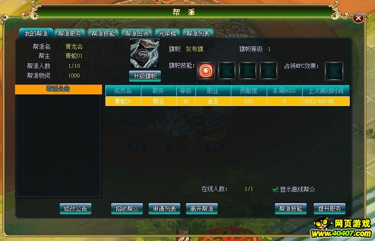 建立帮派:玩家等级到达30级,花费50元宝即可建立。