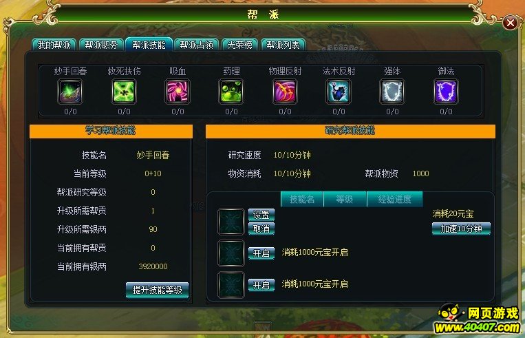 每十分钟结算一次,扣除对应物资,同时给对应的技能增加经验值。如果帮派物资不够扣除的话,则不扣除帮派物资,同时不会增加研究经验。