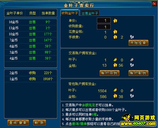 点击收购/出售金叶子标签页,在单价框中输入收购/出售金叶子的单价,单价默认为1金,在收购/出售数量框中的填写金叶子数量;花费/获得金钱栏会显示玩家这笔交易所会花费/获得的金币总数;手续费栏会显示玩家这笔交易所需要交纳给系统的手续费;填写好出售单价和出售金叶子数量后,就可以点击开始挂单按钮
