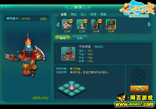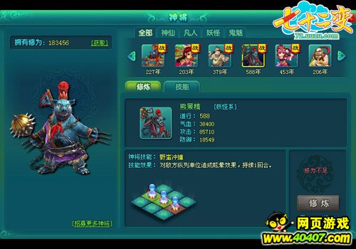 其次,选择一些提供攻击加成较高的神将,比方说神将阿蛮,玩家变身为神将阿蛮之后,会在之后的两个回合内比例增加攻击输出,此时再配合其他神将变身后的攻击加成,能将攻击值提升一大截。另外,选择一些有特殊技能的神将也是制胜妙法之一,比方说熊罴精,简直是个逆天的神将!玩家变身熊罴精后的攻击能将对手眩晕,这无疑增加了玩家当局的生存时间,多活一局,就多一局的攻击输出。