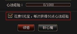 1.每次领悟心法都会随机获取一定的心法经验,我们也可以选择花费一定的元宝使每次领悟都固定获取50点心法经验。(当然,我肯定充了些元宝啦,想要强力,必须RMB啊)