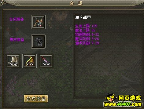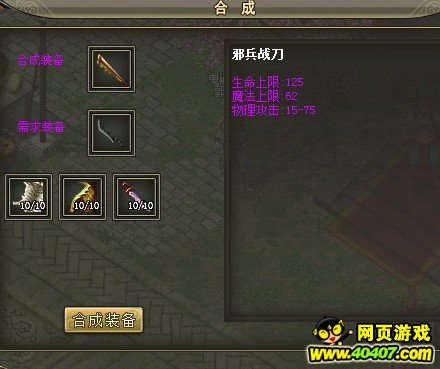 需要合成的东西都齐全之后您双击在包裹里面的合成符就出现以下的图片,玩家点击合成装备就可以合成了,双击包裹里面的合成装备就可以了哦!