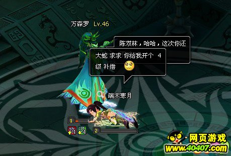 镇妖塔四层BOSS万森罗,难度比起上一层又加了许多,这个长得绿油油的怪人,貌似记得他开头会说一句,他最喜欢绿的东西,比如绿帽子O(∩_∩)O哈哈~!本层建议开始先清小怪,BOSS第2回合会晕人,第3给自己加50%攻击,第4回合会用上抱元守一,减伤40%的攻击,第7回合释放群体攻击技能,第10回合会释放一个很恶心的控制技能冰雷爆,附带全体眩晕的效果,之后又放一个群攻魔法,同样中招之后会持续掉血,第12回合BOSS会狂暴,给自己加8000血跟50%攻击!本层推荐战力4800以上,等级50以上,原因嘛,因为50级就能使用天心丹回复3200的大药,所以你懂得。