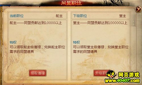 同盟职位,取决于玩家各自的贡献值,随着对同盟的贡献上升,可以提升同盟中的职位,享受更多俸禄和特权。