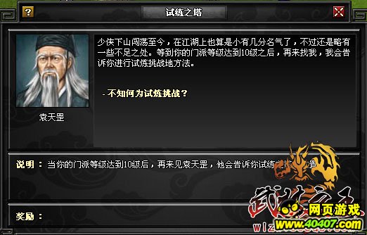 玩家通过在【回疆】副本NPC“袁天罡”的支线任务,激活并开启“试练塔”系统。