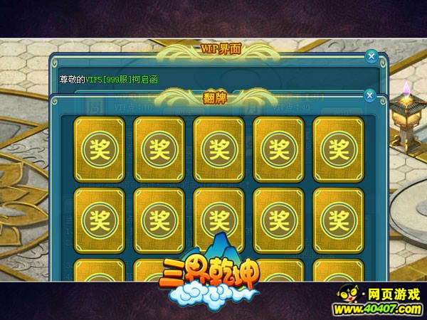 还记得电视节目中的翻牌子抽奖品么?在《三界乾坤》中,你也可以随机翻牌,每次都能抽中或多或少的奖励哦。当次数用完的时候,你还可以用元宝来延续次数。翻到更多宝贝。