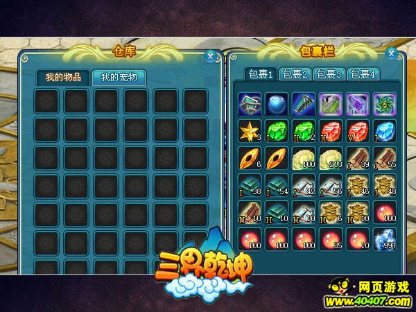 仓库用于存放银两和宠物,相当于玩家的一个小金库和宠物园。在这里,玩家可以随取随村,也可以全部取出。当你背包满了的时候,仓库将为你准备更多空间用于放置装备物品等等。