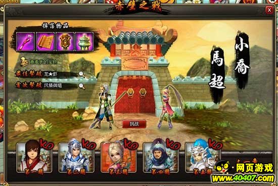 马超素有《龙将》“永动机”之称,因为他的技能附带增加自身100点士气的效果,可以连续释放技能,而小乔也是控制流武将中的翘楚,所以,当玩家在过关斩将关卡中碰到这一对组合的时候,可以说将要面临巨大的挑战。这一关卡要求玩家阵列中军速度达到9200以上,主将技能使用“声东击西”。在战斗中,要求前军能够扛住对方的两轮技能攻击,输出要求主将和第二输出将释放技能后能将对方前军打死,第一输出将技能至少打死对面一个中军,并且,当第三轮攻击进行时,必须保证能够杀死马超。