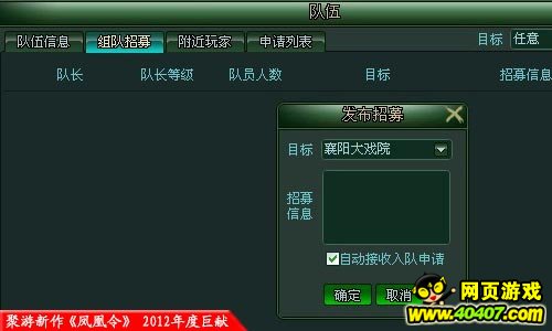 《凤凰令》的组队系统不是说想组就能组的。在未组队的状态下,玩家可以先创建队伍,然后发布“队友招募”信息,向任意或者指定玩家进行组队。在组队情况下,玩家只需要发出邀请即可。
